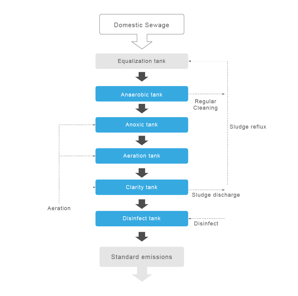 该系统采用现代技术,将厌氧-缺氧-好氧(AAO)工艺与移动床生物膜反应器(MBBR)技术相结合。这种强强联合可最大限度地去除有机污染物和营养物质。因此,处理后的出水始终符合严格的排放标准,从而保护当地环境。这种先进的生物处理工艺确保系统即使在乡村民宿和旅游景点常见的各种负荷条件下也能可靠运行。
