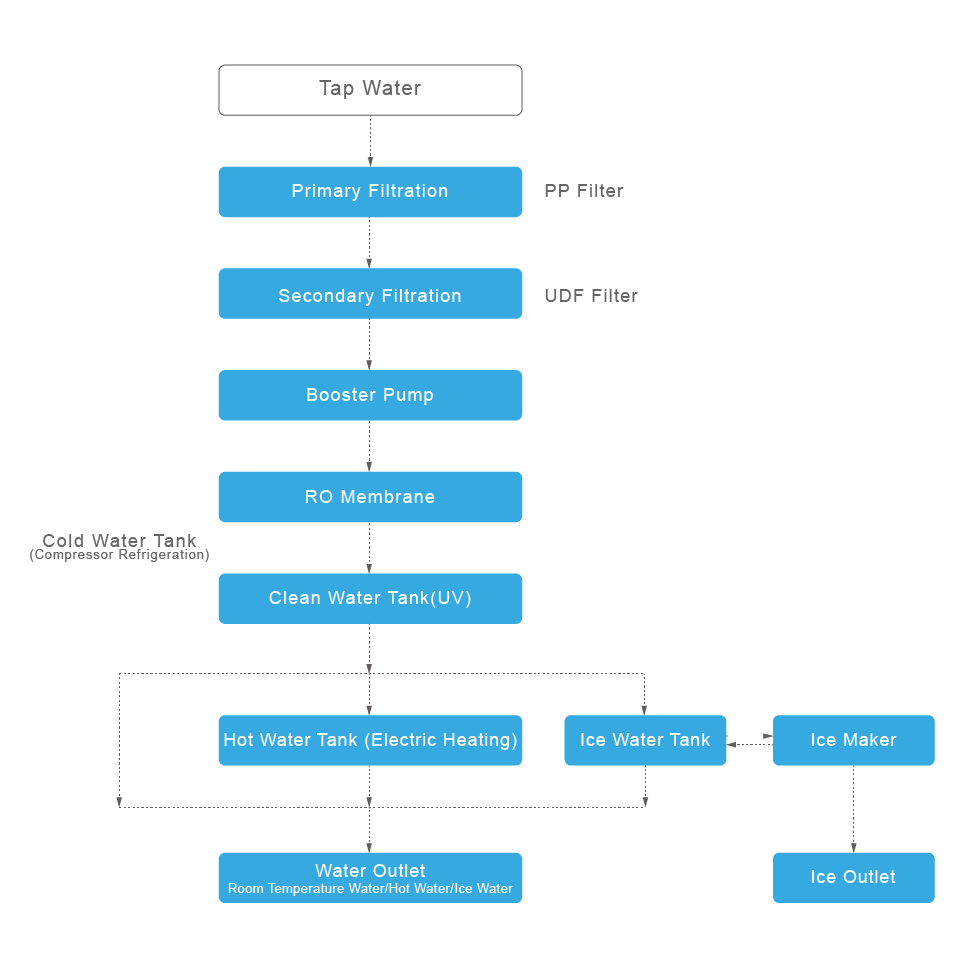 这款立式饮水机采用两级过滤系统,每一级都提供不同程度的净化。它还配备了反渗透膜组件,与两级过滤系统协同工作,通过多层过滤,最终将水转化为安全、即饮的饮用水。该饮水机可按需提供热水、冷水或常温水。此外,它还具备制冰和制作气泡水的双重功能,提供多样化的选择。